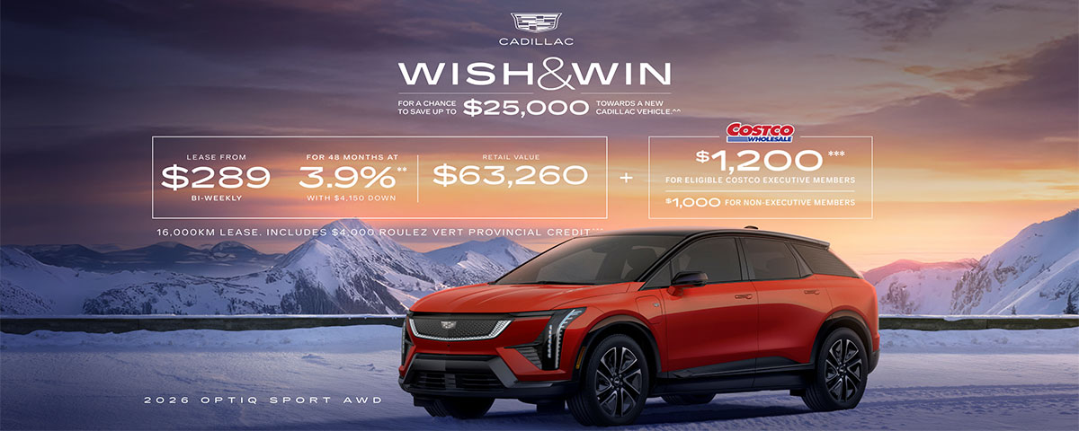 ^^No purchase necessary. Open to age of majority residents of Canada. Starts Dec 2, 2025 and ends Jan 2, 2026 (local time). Each eligible entrant is deemed a potential prize winner. Each prize consists of a voucher ranging from $500 up to three total prizes (one per region) of $25,000 towards the subsequent purchase/lease of one new Cadillac vehicle from an authorized Dealer by Jan 2, 2026, subject to availability and contest rules. No cash value. Prizes awarded by geographic region: BC‑MB, incl territories (Western); ON (Central); and QC‑NL (Eastern). There is no limit to the number of $500 voucher prizes. 164,710 total prizes (excl. $500 voucher prizes) available at start, divided per region (see full rules for details). Odds of winning range from 1:50,000 to 1:1.69. Total number of prizes (excl. $500 prize) and odds of winning will decrease as prizes are awarded. Math skill‑testing question required. See Dealer or https://wishandwin.ca/rules for contest entry/prizes/odds details and full rules.