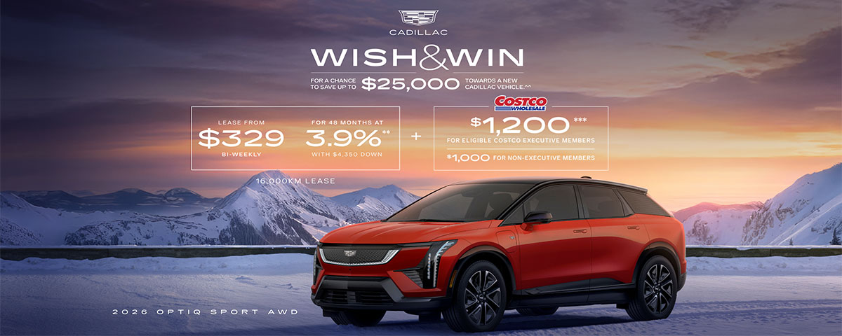 ^^No purchase necessary. Open to age of majority residents of Canada. Starts Dec 2, 2025 and ends Jan 2, 2026 (local time). Each eligible entrant is deemed a potential prize winner. Each prize consists of a voucher ranging from $500 up to three total prizes (one per region) of $25,000 towards the subsequent purchase/lease of one new Cadillac vehicle from an authorized Dealer by Jan 2, 2026, subject to availability and contest rules. No cash value. Prizes awarded by geographic region: BC‑MB, incl territories (Western); ON (Central); and QC‑NL (Eastern). There is no limit to the number of $500 voucher prizes. 164,710 total prizes (excl. $500 voucher prizes) available at start, divided per region (see full rules for details). Odds of winning range from 1:50,000 to 1:1.69. Total number of prizes (excl. $500 prize) and odds of winning will decrease as prizes are awarded. Math skill‑testing question required. See Dealer or https://wishandwin.ca/rules for contest entry/prizes/odds details and full rules.