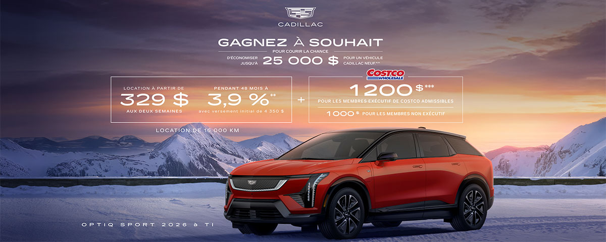 ***Pour être admissible à la prime de 1 200 $ (membres Exécutifs)//1 000 $ (membres autres qu'Exécutif) réservée aux membres, vous devez être résident canadien et détenir un permis de conduire valide, être membre de Costco depuis le 1er décembre 2025 ou une date antérieure, et vous devez : (1) vous inscrire auprès de Costco pour recevoir votre numéro d'autorisation non transférable; (2) présenter le numéro d'autorisation à un concessionnaire participant; (3) acheter, financer ou louer au détail un véhicule neuf ou de démonstration 2026 admissible ou un véhicule Cadillac OPTIQ, LYRIQ, Escalade IQ 2025 en stock (jusqu'à épuisement des stocks) et 2026 ou Cadillac VISTIQ, Escalade IQL 2026 livré entre le 1er novembre 2025 et le 2 janvier 2026. Une commande à l'usine ou un échange par le concessionnaire peut être requis, mais peut ne pas toujours être disponible, le cas échéant. La prime est déduite du prix d'achat du véhicule après taxes. L'achat ou la location d'un véhicule n'est pas admissible au calcul de la remise annuelle de 2 % pour les membres Exécutif de Costco. Cette offre n'est pas monnayable. Des conditions et restrictions s'appliquent à cette offre d'une durée limitée. Communiquez avec votre concessionnaire participant pour obtenir plus de détails.